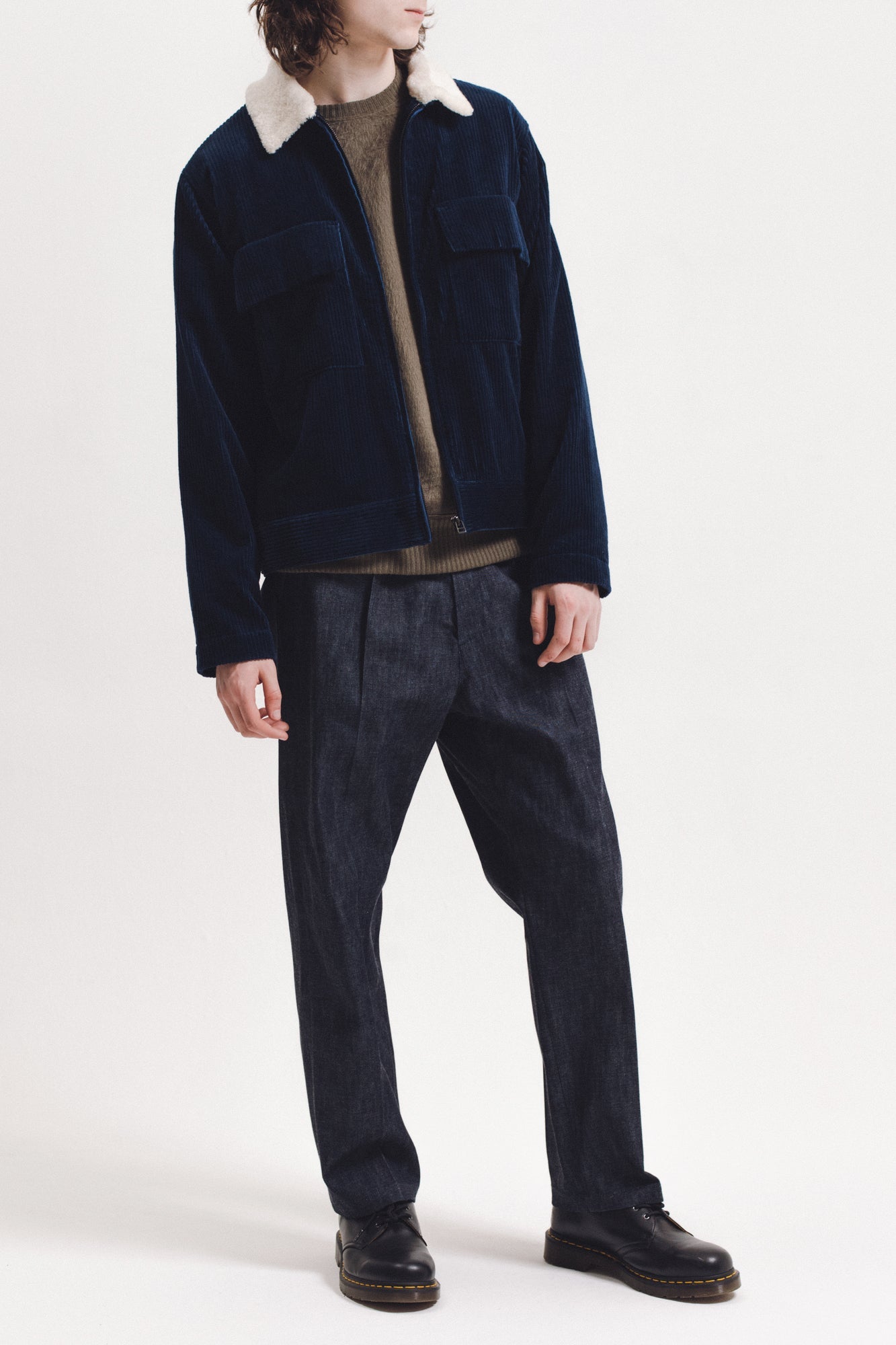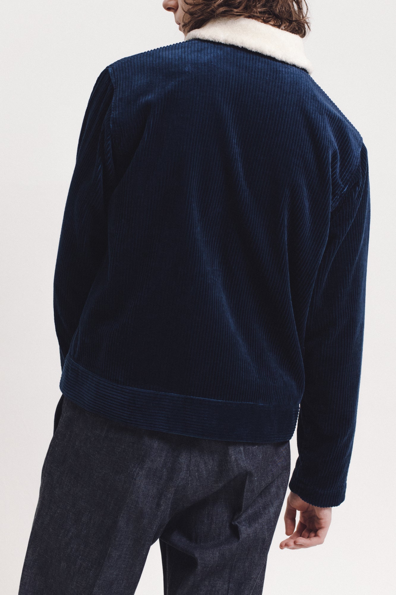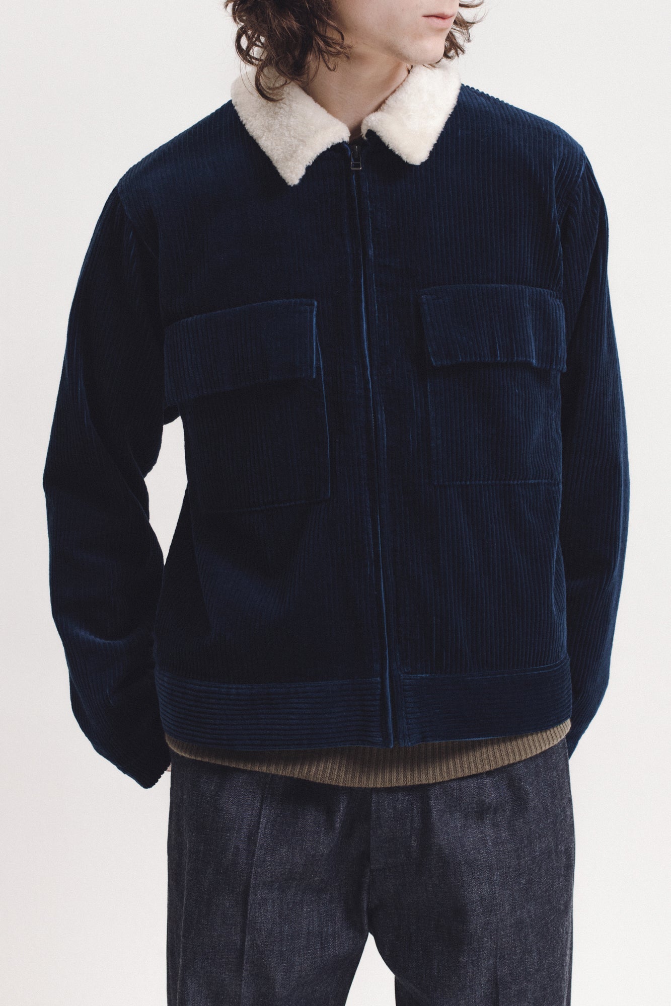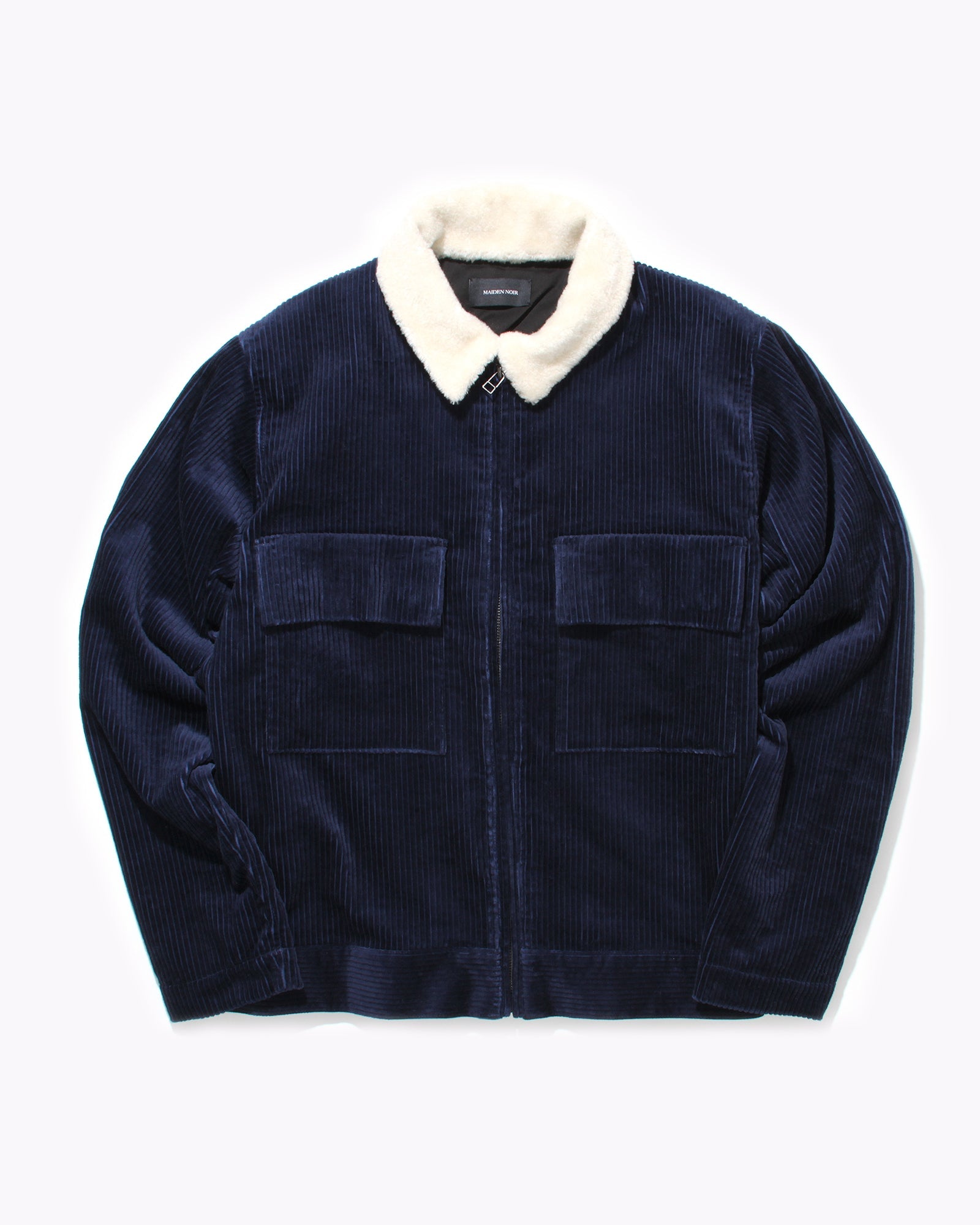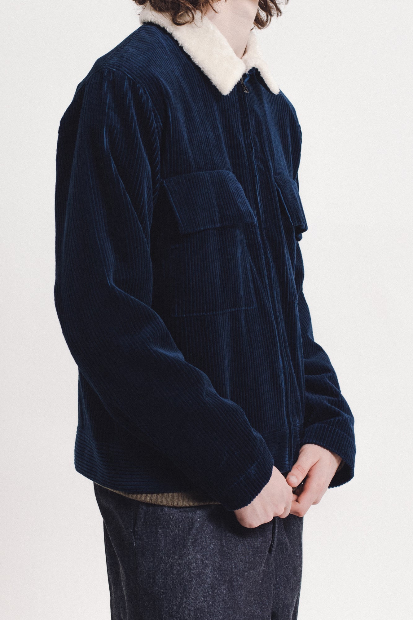 The Corduroy Trucker is produced in medium wale cotton corduroy fabric with a deep color saturation. Features a concealed zip closure, two chest pockets and a shearling lined collar.