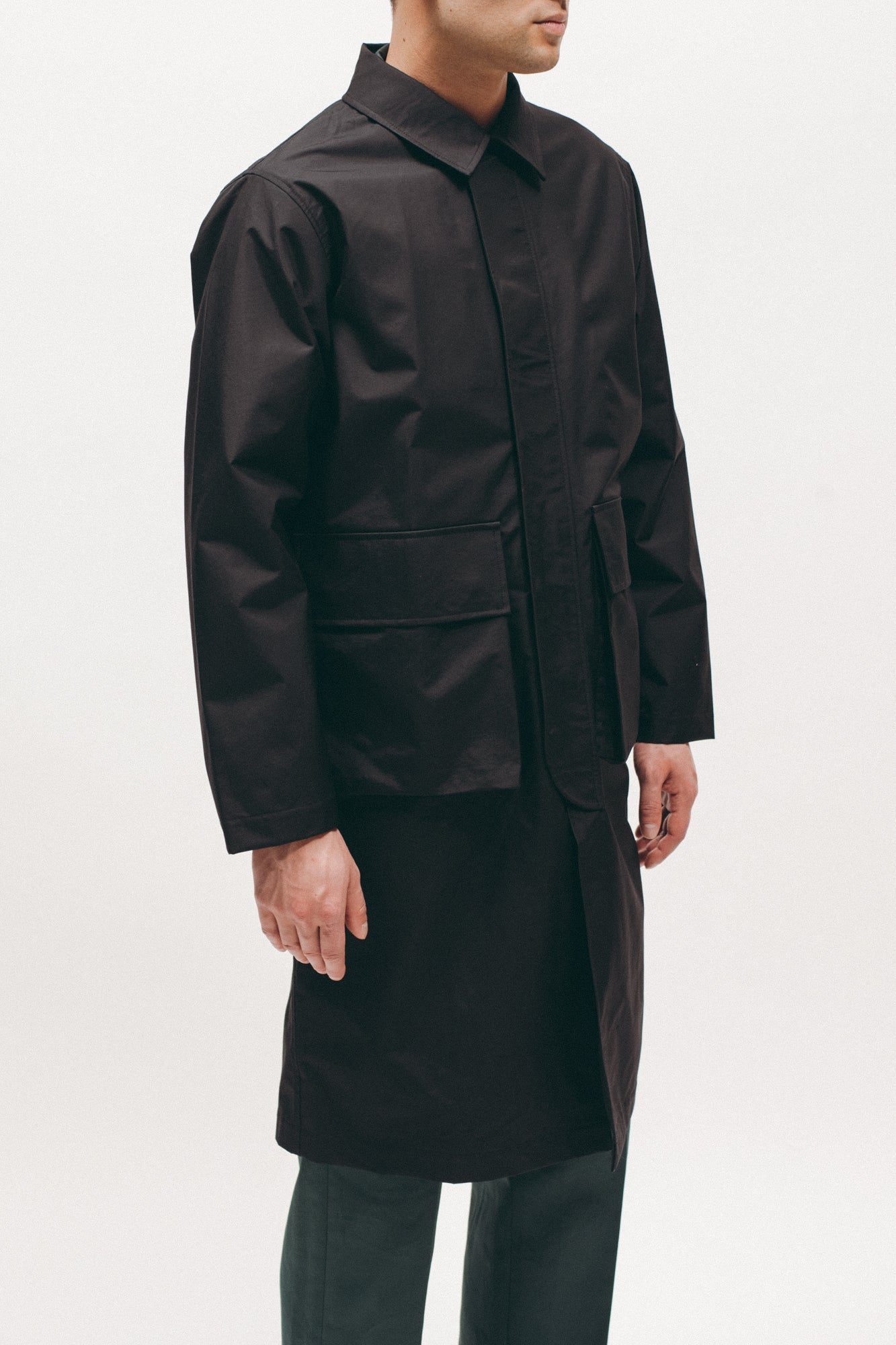 The Hooded Mac Coat is constructed out of breathatec, a coated nylon material, and features patch pockets with flaps and a hand warmer pocket.