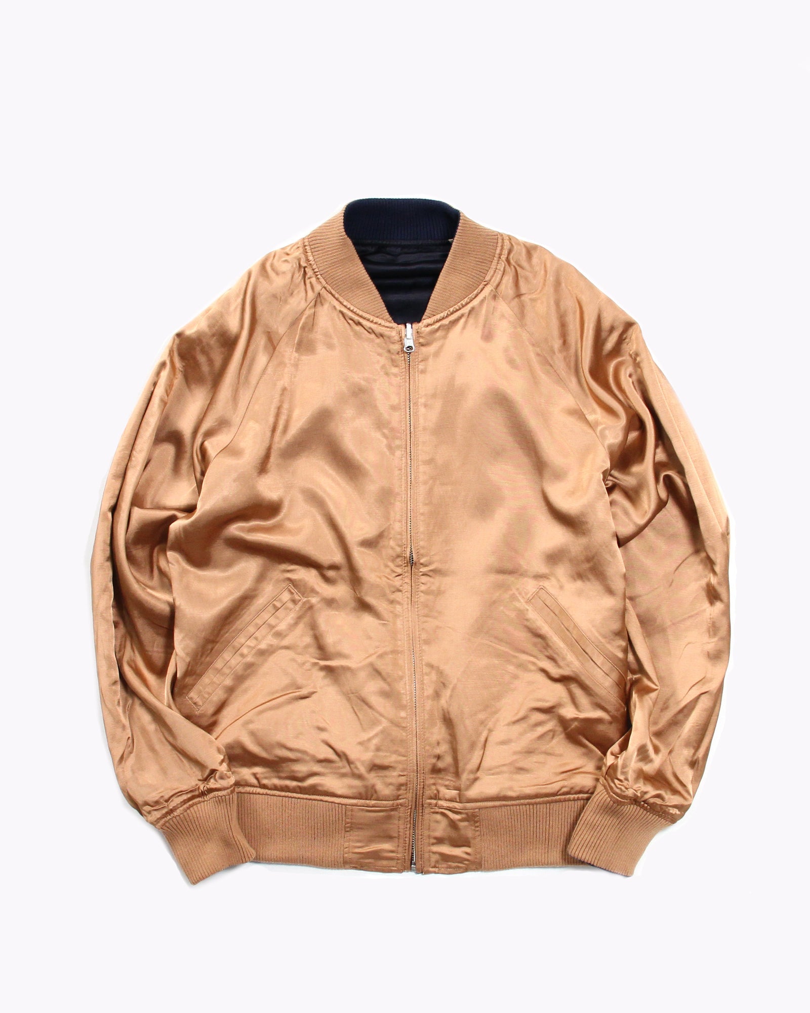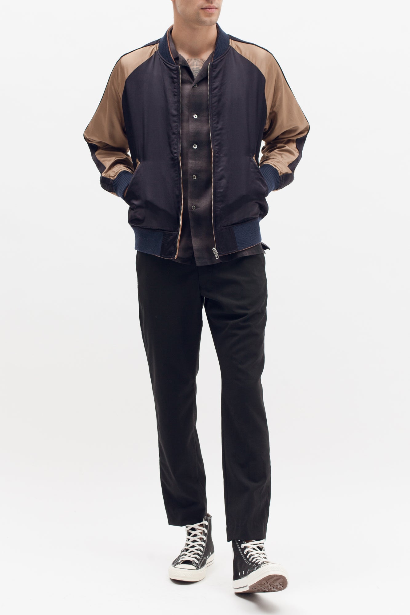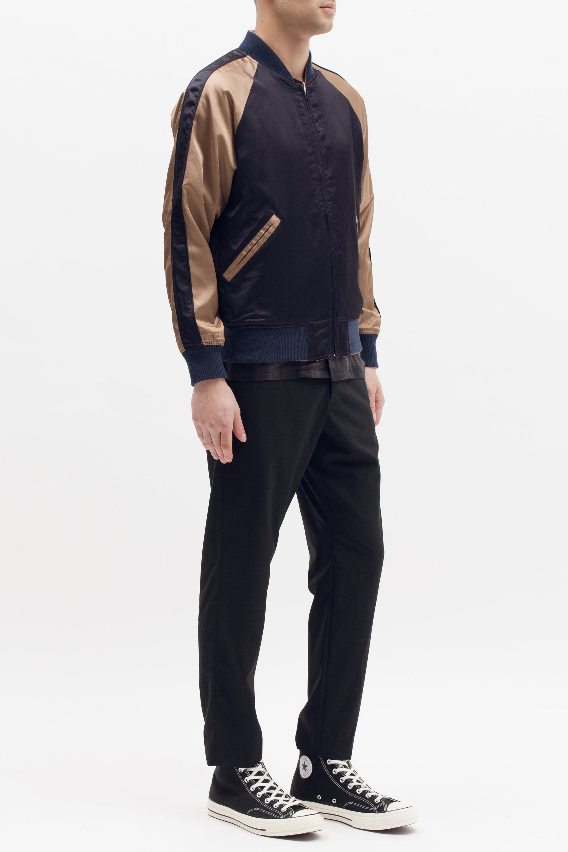 The Reversible Satin Souvenir Jacket is a color-blocked bomber style produced in satin-like rayon.
