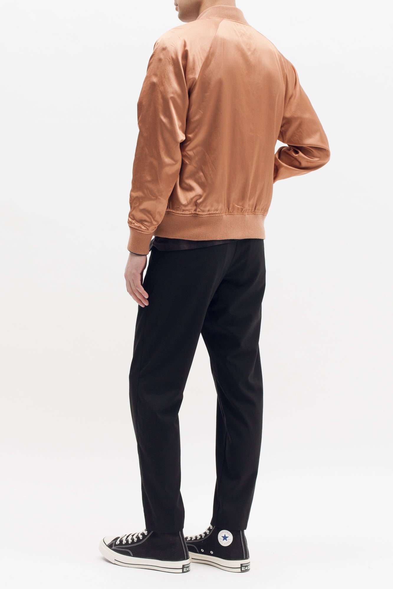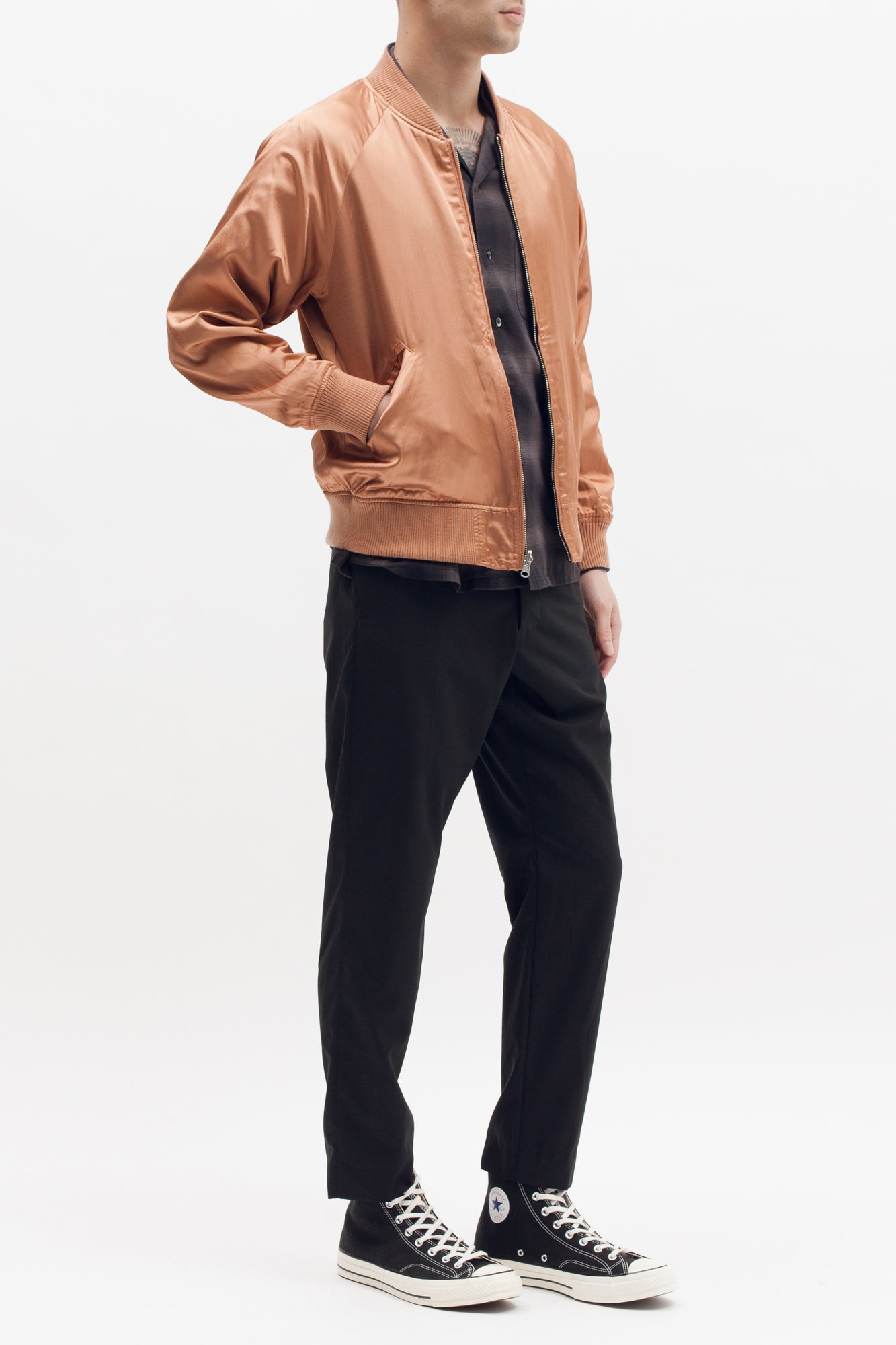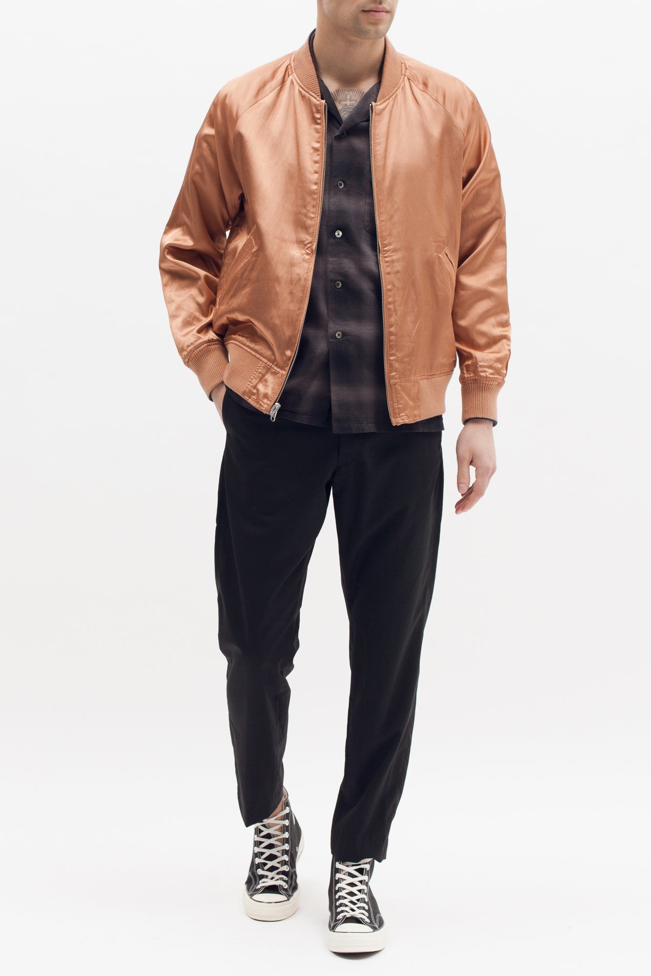 The Reversible Satin Souvenir Jacket is a color-blocked bomber style produced in satin-like rayon.